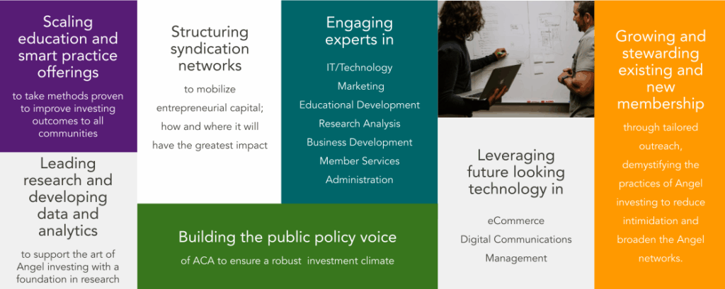 Our community will always be only as strong as the commitment of our members. Join, get involved and increase your engagement to build a brighter tomorrow than would otherwise be possible. We want to encourage all of you and the millions of potential/future angels to join us in our journey. If you are deploying capital to grow early stage companies, growing that company, or otherwise contributing to their maturation, you are part of this critical ecosystem and we invite you to engage with us! Help us create a powerful network of entrepreneurs, investors and community resources so that we can continue to support economic growth and drive innovation. Angel investing is a team sport and ACA welcomes you to join us as we strive to make angel investing more accessible and successful for all.