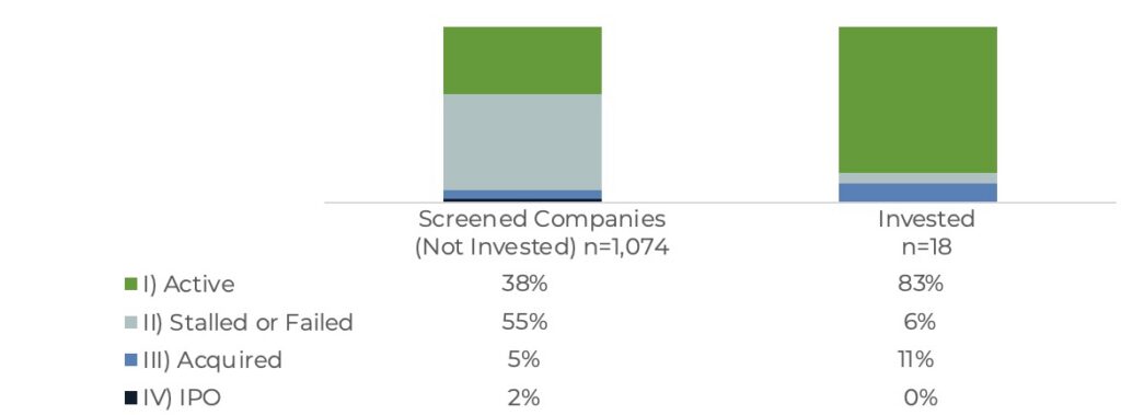 Companies that received BioAngels investment were far less likely to fail or stall and more likely to remain active or reach an exit. Screening does not remove risk, but it meaningfully shifts the outcome distribution toward survival and progress rather than attrition.