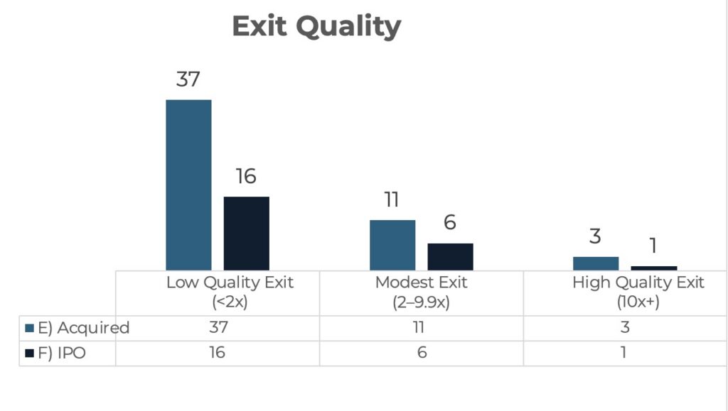 - Exit labels alone overstated success. After accounting for return multiples, most IPOs and acquisitions clustered in low-return categories.